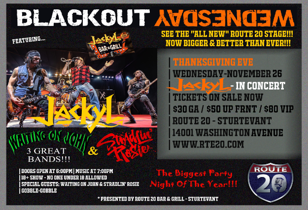 Route 20 Bar And Grill presents "BLACKOUT WEDNESDAY" featuring JACKYL! The Biggest Party Night Of The Year, the night before Thanksgiving! Special Guests...Waiting On John & Stradlin' Rosie.