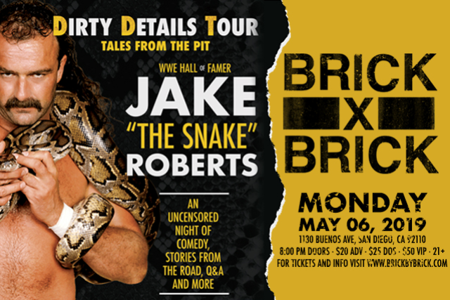 WWE Hall of Jamer Jake “The Snake” Roberts presents the Dirty Details Tour. Roberts unleashes stories of the road and pranks he played on his opponents. You might hear about Andre the Giant, Macho Man Randy Savage, Ravishing Rick Rude, and so many more. Whether you are a wrestling fan or not, this one of a kind storyteller is bound to keep you wrapped in his coils and will leave you wanting more.