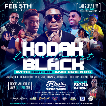 Please note: This event is the rescheduled date for the postponed Kodak Black show on Saturday November 6, 2021. All tickets purchased for the postponed show (that were kept and not refunded) will be honored this Saturday show at Ferg's Concert Pavilion on February 5, 2022. We look forward to seeing you there!