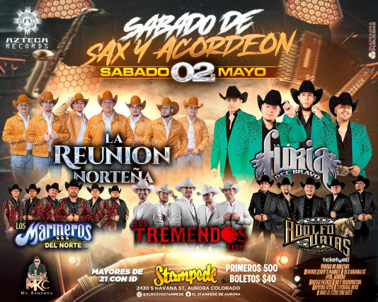 SÁBADO 2 DE MAYO – SAX y ACORDEÓN NIGHT  Se Agregan más agrupaciones!!  PRIMEROS 500 BOLETOS A SOLO $40 En Stampede se viene una noche brutal que no te puedes perder   EN VIVO:  La Reunion Norteña  La Furia del Bravo  Marineros del Norte  Los Tremendos León  Adolfo Urias y Su Lobo Norteño  DJ Mr Kchondo en las mezclas