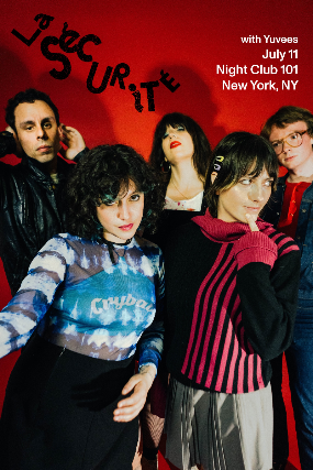 La Sécurité (Montréal/Tiohtià:ke) is a collective whose art punk is equal parts: jumpy beats, off-kilter arrangements and minimalistic melodic hooks. The music is all about living dangerously, perfectly agreeable to being blasted onto dancefloors; while the lyrics share the ethos of the Riot Grrrl movement, and celebrate the autonomization of women, friends (mean and nice) as well as benevolence. These five scattered, yet creatively concerted entities also propose a wide arsenal of D.I.Y. music videos, visuals, screenprints, patented dance moves, etcetera! Debut album Stay Safe! (June 16th, 2023 via Mothland) showcases songs that are empowering, flush with urgency, but also denote a dash of melancholia. Bill Pearis from BrooklynVegan describes the long-player as “an enticing batch of party-friendly jams shouted in sneering Franglais that recall everything from Le Tigre to Neu! to Kleenex/Liliput (also Montreal’s Duchess Says)”. As they gear up for their forthcoming US tour supporting The Go! Team, La Sécurité tease us with a first single via British imprint Bella Union, dancy-topsy-curvy “Detour” (October 22nd, 2024), also available on the other side of the pond via boutique label Mothland (CA/US).