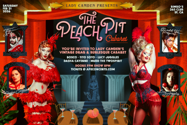Back by popular demand.. Lady Camden’s new show, The Peach Pit Cabaret, returns to Bimbo’s 365 Club on February 21. Merging the worlds of drag, burlesque, lounge, performance art, live music, and even circus tricks- with a vintage twist straight out of Moulin Rouge.
