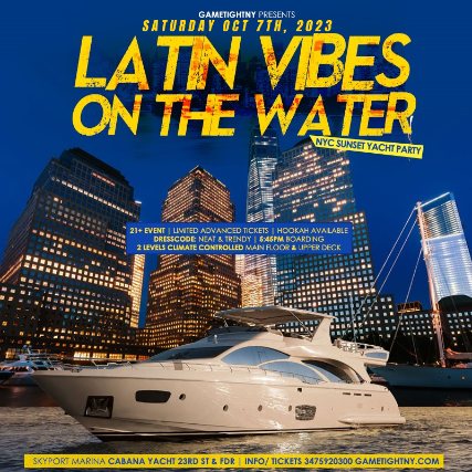 For more ticket information on Latin Vibes Saturday NYC Cruise Sunset Cabana Yacht Party 2023 call/ or text 3475920300 or GametightNY.com