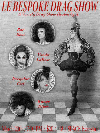 Le Bespoke Drag Show, hosted by X, and featuring performances by Bae Root, Vanda LaRose, Irregular Girl, and Winter Diorr, is a showcase of artists who have something to say, debuting conceptual performances rooted in jazz, show tunes, and music of a bygone era. The show speaks to Space's art-centric atmosphere and provides a unique and unforgettable experience for customers and drag audiences alike. Bespoke, a word meaning "custom-made or tailored to an individual's specific needs," is used colloquially in the queer community as one-of-a-kind and of a higher caliber.