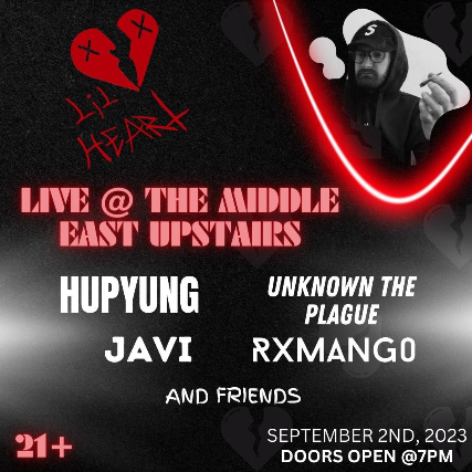 The Middle East presents: Lil Heart, Hupyung, Unknown The Plague, Javi, Rxmango & friends - 18+ $12 Advance / $15 Day of Show 8:00pm doors