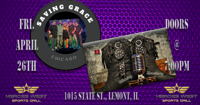 Saving Grace and Whiskey & Harmony are performing on Friday, April 26th at Heroes West in Lemont. Come early for dinner and stay for the show! This is a 21+ Event