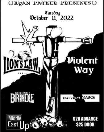 Ryan Packer presents: Lion's Law, Violent Way, Blood Stained Brindle, Battery March - All Ages, $20 Advance / $25 Day Of Show, 7:00 PM Doors NO VAPING OR SMOKING IN THE BUILDING