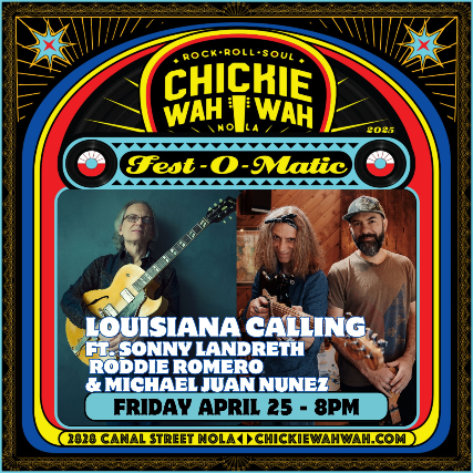 As part of our Fest-O-Matic series, we are excited to bring back “Louisiana Calling,” a 3-night residency by one of the finest slide guitar players to ever pick up the instrument…Lafayette’s own Sonny Landreth! Bonnie Raitt calls him, “one of the most astonishing guitarists I know.” Eric Clapton says, ““Sonny Landreth is probably the most underestimated musician on the planet, and also probably one of the most advanced.” With multiple Grammy nominations and credits that include Clifton Chenier, Jimmy Buffett, John Mayall and John Hiatt, Sonny has been lighting up stages around the world for decades. And we are blessed that he chooses Chickie Wah Wah as the place to do a residency with some of his favorite musicians in South Louisiana. Each night will feature another artist handpicked by Sonny starting with a full set of their own music, and then Sonny closing the show with a set of his own.   On Friday, 4/25, Sonny will be joined by fellow Lafayette rockers (and Grammy nominee) Roddie Romero and Michael Juan Nunez. These guys are the cream of the crop when it comes to authentic Louisiana music.   Sonny and his band will follow with a set of their own on each night. All of the shows in this series are going to be absolute stand-out highlights in a jam packed Jazzfest season, so get your tickets now and get ready to rock!