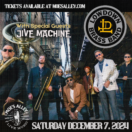 Moe's Alley presents Chicago's baddest soul, funk, jazz group - LowDown Brass Band - with special guests Jive Machine!  Saturday, December 7th Doors: 8pm / Show: 9pm $17 in advance / $22 day of the show 21+ *Tickets on sale Friday, Aug. 23rd at 10am PT* LOWDOWN BRASS BAND Embodying the vibrant Chicago music culture, LowDown Brass Band is a one-of-a-kind horn ensemble weaving the rhythm of the streets with conscious hip hop, reggae, and soul.  Rigorously touring, LowDown has performed on the most unique stages, from the Montreal Jazz Fest to the Cotai Jazz Fest. Despite the last four years, LowDown has stayed busy, releasing Three albums, "The Reel Sessions, LowDown Nights and $itizens of the World”, which showcase their unique sound and further push the boundaries of their genre.  Leaning on their talent and unconventional style, LowDown Brass Band continues to carve out a path, defying convention and charting their own course in the ever-evolving landscape of music. JIVE MACHINE Jive Machine habitually bends the rules, blurs the lines, and stretches musical boundaries. Their music takes listeners on a sonic rollercoaster that fuses elements of old-school funk, progressive rock, blues, and soul. Throughout their set, you can hear diverse influences such as Tower Of Power, Jimi Hendrix and Trombone Shorty. Jive Machine is uniquely able to incorporate new ideas while paying homage to the great artists who came before them. The band is defined by a strong rhythmic foundation, infectious melodies, tasteful lead guitar virtuosity, and crisp horn lines.  Recently, Jive Machine has become notorious for their "pop-up" performances in downtown Santa Cruz. These events always erupt into a massive dance party, and within moments, you'll see It's impossible not to be captivated by the talent and contagious energy of their live shows!