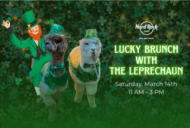 Join us at Hard Rock Cafe San Antonio for a Lucky Brunch with The Leprechaun! π©π Strike a pot of gold with our Chef Specialty brunch buffet, a coloring sheet station, a DIY St. Patty's temporary tattoo station music, family photos with The Leprechaun, and a special petting zoo featuring many lucky guests! β¨