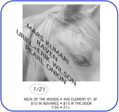 Mars Kumari Raven Uriel + Erik Wilson Pearl Onion Sunday January 21st 2024 Neck of the Woods 406 Clement St San Francisco, CA 94118 $10 in advance $15 at the door Doors at 7:30pm 21+