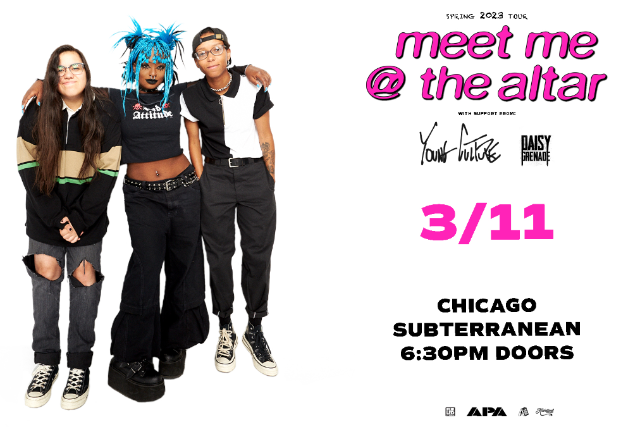 Meet Me @ The Altar present a new musical and cultural paradigm for pop punk. The Florida-based trio— Edith Johnson [vocals], Téa Campbell [guitar], and Ada Juarez [drums]—write the kinds of anthems that you can scream along to at a festival, head-bang to in a club, or sit with while in your feelings at home. The women may have met via YouTube - in true modern-day fashion - but the band shares a classic mission. Flipping the script for rock music and its culture, they bring together elements of Warped Tour- era punk, 2010s pop, and easycore. In 2020, early champions such as Halsey, Alex Gaskarth of All Time Low and Dan “Soupy” Campbell of The Wonder Years came forward as the trio inevitably inked a deal with Fueled By Ramen. On the heels of singles “Garden” and “Hit Like A Girl,” widespread tastemaker praise