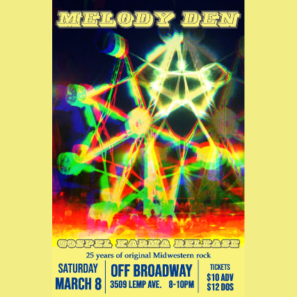 Melody Den are a St. Louis-based band that formed in 1999. The core band is John Baldus (drums), Jerry Baugher (guitar), Marc Chechik (guitar) and Dave Melson (bass). John, Marc and Dave met while playing in another St. Louis band, Waterloo. All three are veterans in the St. Louis music scene. After the three had been together a couple