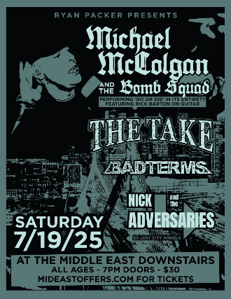 The Middle East presents: Michael McColgan & The Bomb Squad - performing "Do or Die" in its entirety with Rick Barton on guitar, The Take, BadTerms, Nick and The Adversaries - All Ages, $30, 7:00PM doors