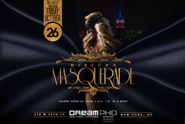 Masqueraders, Carnivalers, come one and come all, we are upping the antics for Midtown’s Halloween party of the year at PHD Terrace located at Dream Midtown. Come celebrate in style in your best attire for the ‘Midtown Masquerade’!  The night offers Masquerade mask giveaways, two floors of live dj’s mixing today’s best hip hop, house, and dance music, delicious cocktails, two indoor/ outdoor terraces, incredible city skyline views of Times Square! PHD Terrace located at the Dream Midtown hotel brings an incredible Halloween party.  Purchase tickets and reserve tables in advance to avoid lines and get the best table packages available for your group to party!   Event Offerings: Special Guest DJs until 4am Masquerade masks giveaways A variety of incredible costumes, some spooky, some sexy, but always daring!  Costumes are not mandatory but highly encouraged 2 gorgeous floors of indoor/outdoor terraces Incredible skyline view of the city and Times Square Hundreds of Young Professionals to Meet Top 40 and the other International Beats Spinning Delicious handcrafted cocktails Table/Bottle Service Recommended, especially for small and large groups Amazing State of the Art Lighting, Sound & Decor   Must be 21+ with valid ID to enter. Tickets are only valid till 2am and aren't guaranteed to be honored after 2am. All sales are final. No refunds.