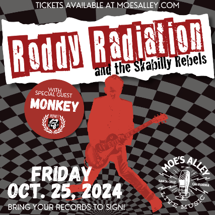 Moe's Alley presents the lead guitarist from the iconic 2-Tone band The Specials! It's Roddy Radiation & The Skabilly Rebels with special guest Monkey plus DJ Archive 65!  Friday, October 25th Doors: 8pm / Show: 9pm $20 in advance / $25 day of the show 21+ RODDY RADIATION & THE SKABILLY REBELS Roddy Radiation is the world-renowned legendary lead guitarist for The Specials, and he's coming to your town! Formed in 2003, The Skabilly Rebels rose from the ashes of The Specials and continued the course of blending Ska and Punk with Roddy’s signature Rockabilly guitar work. Their sound is steeped in the cool of the 1950's-80’s era, and the rhythms come down on you with an all-out Blues Attack. The Skabilly Rebels are sure to get the crowd moving!  As a hit songwriter, Roddy’s creations have been featured on movie and television soundtracks and commercials across the globe. Songs like “Concrete Jungle", "Rat Race" and "Hey, Little Rich Girl" were recently used in the BBC’s hit series “This Town.” His contribution to modern music is immense, as he single-handedly brought about the Ska Punk movement, while he also helped to create the world’s fascination with post-Jamaican music, but have been covered by artists like Tim Timebomb (Rancid), and Amy Winehouse. MONKEY MONKEY is a 5 piece high-energy organ driven, Ska/Reggae group from the SF Bay Area. Their intense live shows and rock-steady rhythms not only get the crowds dancing, it has won them several awards, like the prestigious California Music Award! MONKEY has 4 full-length albums, and has also been featured on over 25 compilations, video games and film soundtracks, including the independent horror-comedy Russ Meyer tribute “Pervert the Movie” on Stag Films. MONKEY has toured the U.S., Europe, Great Britain, Canada, & Mexico. MONKEY has supported world class acts like: Bad Manners, The Specials, The English Beat, The Skatalites, Fishbone, The Slackers, Hepcat and many more...