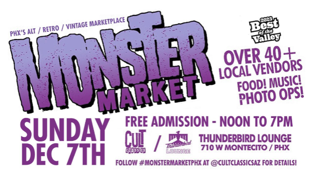 Kick off the holidays with your friends at @cultclassicsaz for our Holiday Monster Market from @monstermarketphx at @thunderbirdloungephx on Sunday December 7th from noon to 7pm! Shop locally for the holidays with 40+ vendors, DJ set from @700tapes and get some gifts locally - FREE, all-ages, pet-friendly - tag your friends and save the date!