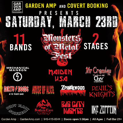 11 Bands, 2 Stages!   Get ready for another full day of Metal Tribute bands! Full Bar for 21+ and Food Truck   Saturday March 23, 2019 | DOORS @ 3:30     Monsters of Metal Fest 2 @ Garden Amp Saturday - March 23rd 2019     Bands Rocking Out on 2 stages!   Mainstage - The Amp   3:30                Doors Open 5 - 5:40pm             Dirty Deeds Rocks 6 - 6:40pm             Mechanical Manson 7 - 7:40pm            Zombiewood 8 - 8:40pm            Mr. Crowley 9 - 9:45pm            Maiden USA       Inside stage - the Locker Room     5:30pm - 6pm         Sign of the Southern Cross 6:45 - 7:15pm        Like Zeppelin 7:30 - 8:05pm        Devils Knight 8:20 - 8:55pm        Dirty Black Summer 9:10 - 9:45pm        House of Alice 10:00 - 10:45pm        Big City Nights   Doors 3:30pm