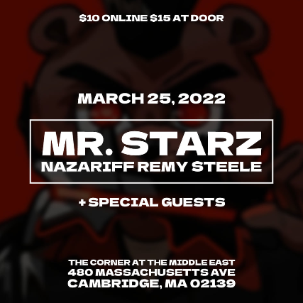 The Middle East presents: Mr. Starz, Nazariff, Remy Steele + Special Guests - 21+, $10 Online / $15 At The Door, 10:00 pm Doors