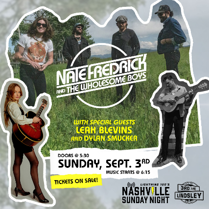Nate Fredrick and The Wholesome Boys: Nate Fredrick and The Wholesome Boys is a solid, hardworking honest band. Nate and The Boys can write catchy songs, blend genres together naturally, play as a unit, and perform four part harmonies like the good old days, all the while, retaining that human soul and edge that seems in short supply. There aren’t many situations where Nate & The Boys' music isn't fit to be played. Short of burying one’s favorite animal, this is the type of music that can be played softly on a Sunday with the family or cranked at rowdy outdoor events. What more can be asked of a band that provides the soundtrack to our lives?   Leah Blevins:  Imbued with the grit of vintage country music and the grace of gospel, Born in Sand Hook, Kentucky, Blevins was raised in a musical family. Her aunts, uncles, and grandparents were in a gospel group called the Harbor Masters and toured Appalachia in the '70s and '80s, so it came as no surprise that Leah harbored her own innate musical talent. Inspired by the rich harmonies of church hymns and the pure country prowess of Dolly Parton and Loretta Lynn -- as well as the more secular sounds of artists like Stevie Nicks. Blevins eventually moved to Nashville at the age of 21 to stake out her own claim in the music business. She issued her first EP, Runnin', in 2015, with Walk Home arriving three years later -- both releases showcased her distinctive voice and poetic lyrics. She relocated to Texas in 2020 to begin work on her first full-length effort. The resulting First Time Feeling was recorded in Dallas with Paul Cauthen and Beau Bedford of the Texas Gentlemen and released in 2021.   Dylan Smucker: Dylan Smucker is a force of nature in the music industry. Living in Nashville he has cut his teeth as a writer and performer. Whether it's downtown or out on the road he can entertain a room with only an acoustic guitar and a voice that seems to come from another time. His songs have a classic sound that will surely stick with you throughout the years.