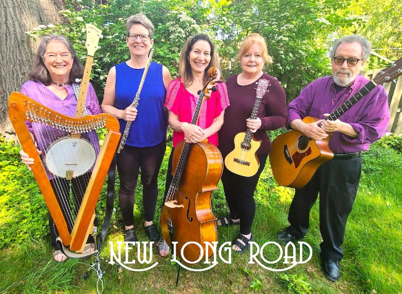 New Long Road is a unique band, a folk-pop-jazz-classical group, consisting of five music-business veterans combining their talents: David Budin (vocals and guitar), Celia Hollander Lewis (vocals, Celtic harp, 12-string guitar, and banjo), Robin Stratton (vocals and ukulele), Julie Myers King (cello) and Linda While (flute). The group performs songs you haven’t heard in a long time, and songs you’ve never heard, including originals, all in ways you’ve never heard them done, with David Budin providing humor and music history between songs.