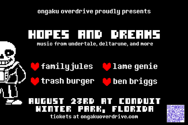 Undertale has been celebrated for nearly a decade for its touching story, quirky characters, and incredible soundtrack. With Undertale’s tenth anniversary coming soon, Ongaku Overdrive proudly presents Hopes And Dreams, a concert featuring live performances of music from Undertale, Deltarune, and other beloved video games. Hopes and Dreams will also feature the FLORIDA DEBUT of renowned YouTube musician and video game shredmaster FamilyJules, who will be joined by Lame Genie, Ben Briggs, and Trash Burger.