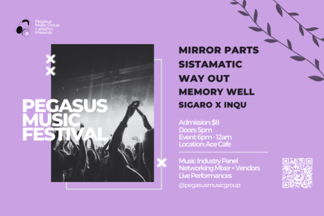 Pegasus Music Group is excited to invite you to our first ever off-campus event, Pegasus Music Festival, which promises to be an incredible experience! Pegasus Music Group is UCF’s largest music industry organization, dedicated to educating and connecting students with opportunities in the music industry. The night will begin with a music industry panel where you'll get to learn from and interact with industry experts. Following the panel discussion, there will be a networking mixer with sounds by DJ Sigaro and DJ Inqu. This is a great opportunity to eat, drink, connect with our guest speakers, and shop with UCF student vendors. We’ll end the night with live performances from local bands: Memory Well, Way Out, Sistamatic, and Mirror Parts. Come support these talented, growing musicians! We hope you can join us for this incredible event, and we look forward to seeing you there! For any questions, please email pegasusmusicgroupucf@gmail.com.