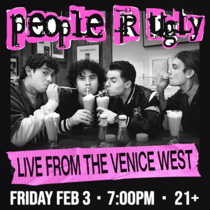 People R Ugly, or PRU for short, is a LA based punk-pop band that started in the summer of 2021. Despite originally starting out as a joke, PRU has quickly gained a devoted fan base while selling out several historic venues across Hollywood. Known for their energetic performances and light-hearted sense of humor, PRU has been making waves in the LA music scene with a much-needed fresh, yet nostalgic, take on punk. Join us at the Venice West for our Anti-Valentines-Day show and come hear some unreleased music for the best night of your lives!