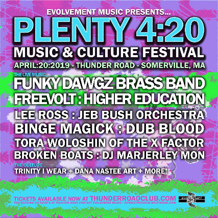 Thunder Road Music Club and Evolvement Music Present… PLENTY 4:20 Music & Culture Festival  Saturday April 20, 2019 Doors at 2pm, Ages 18+ $10 General Admission    RSVP to the Facebook Event Page Here: www.facebook.com/events/551933221951817   The Live Music... Funky Dawgz Brass Band  Freevolt  Higher Education  Lee Ross  Tora Woloshin  Jeb Bush Orchestra  Binge Magick  Dub Blood  Broken Boats  and more coming soon!   The Culture... These exceptional Vendors & Artisans will be displaying their goods at PLENTY 4:20! Trinity i Wear - Reggae Clothing & Accessories Dana Nastee - Epic Art and more to come!   Learn More About Thunder Road Music Club Website: www.ThunderRoadClub.com Facebook: www.facebook.com/thunderroadclub Instagram: www.instagram.com/thunderroadclub   Learn More About Evolvement Music Website: www.EvolvementMusic.com Facebook: www.facebook.com/EvolvementMusic Instagram: www.instagram.com/evolvementmusic   HEY!  FEE FREE BOX OFFICE TICKETS ARE AVAILABLE AT THE CLUB DAILY AFTER 5PM. All online ticket sales have a $4.08 service fee. By purchasing advance tickets, your email is automatically added to Thunder Road's email list! This means you will be the first to know about all of the upcoming shows and events that are on our schedule!