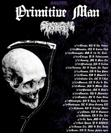 Denver’s PRIMITIVE MAN’s music matches its name: a savage, sparse mix of death metal, blackened noise, and doom riffs. The threepiece was formed in February of 2012 by Ethan Lee McCarthy, Jonathan Campos, and Bennet Kennedy (all current and former members of Vermin Womb, Withered, Clinging To The Trees of A Forest Fire, Death of Self and Reproacher). In October of 2012 the band recorded their debut LP Scorn at Flatline Audio with Dave Otero (Cephalic Carnage, Cobalt, Catheter, CTTTOAFF). Scorn was released a collaboration between Throatruiner and Mordgrimm Records. After the release of Scorn, the band parted ways with Kennedy and recruited Isidro "Spy" Soto to temporarily take over on drums for a number of tours/releases before settling on a permanent replacement in drummer Joe Linden in 2015. The band also self-released a three-song EP in February titled P/M.