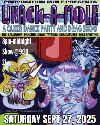 Proposition Mole presents: Whack-A-Mole - a queer dance party and drag show featuring DJs, dancing, drag show, caracitures, face painting and balloons!  Saturday, September 27, 2025 Doors: 8pm / Drag Show: 9:30 $10 in advance / $15 day of the show 21+ *All sales are final *Avoid scammers! Only purchase tickets from moesalley.com or ticketweb.com ==== PROPOSITION MOLE ITS WHACK-A-MOLE TIME!! Get ready for a night of gay dancing, a fabulous drag show, and party festivities  September 27th at Moe’s Alley, or should we say MOLE’S ALLEY, we’re bringing ballroom queer realness to the gays of Santa Cruz so you best be ready to DANCE! As with all of our events we want to raise money for our neighbors who need support. All of the proceeds of this event will be split between families facing unjust deportation and families in need of resources in Palestine. Come support our friends and family facing horrible unjust practices right now Presale tickets are available now for $10 in the link in our bio! And $15 at the door. We’ll also be accepting further donations for anyone wanting to help out more! GET YOUR TICKETS SOON BEFORE THEY SELL OUT ᘛ⁐̤ᕐᐷ*  SERVE * DANCE * VOGUE * STRUT * BRING THE COLOR * BRING THE LOVE * BRING QUEER RESISTANCE!!