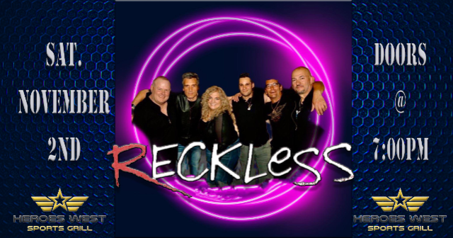Reckless is performing on Saturday, November 2nd at Heroes West in Lemont. Come early for dinner and stay for the show! This is a 21+ Event