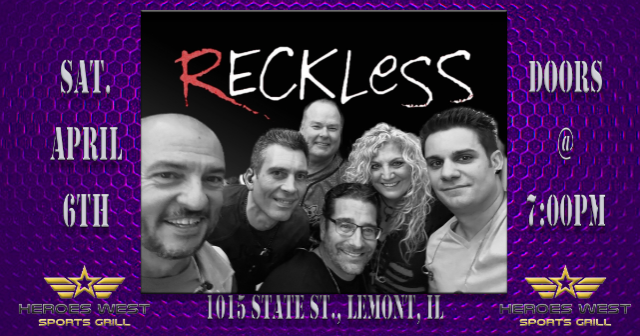 Reckless is performing on Saturday, April 6th at Heroes West in Lemont. Come early for dinner and stay for the show! This is a 21+ Event