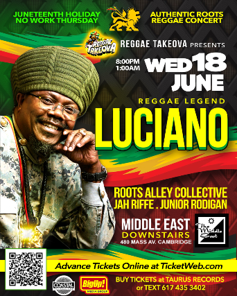 Roots reggae legend LUCIANO ("The Messenjah") touches down Wed June 18 at Middle East Downstairs in Central Square Cambridge performing all his classic anthems for a powerful night of conscious vibes to celebrate the Juneteenth Holiday !
