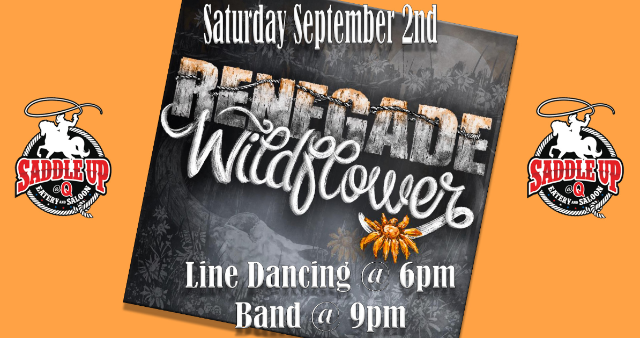 Join us on Saturday September 2 when Renegade Wildflower performs at Saddle Up @ Q. Line dance lessons start at 6pm and the band takes the stage at 9pm.