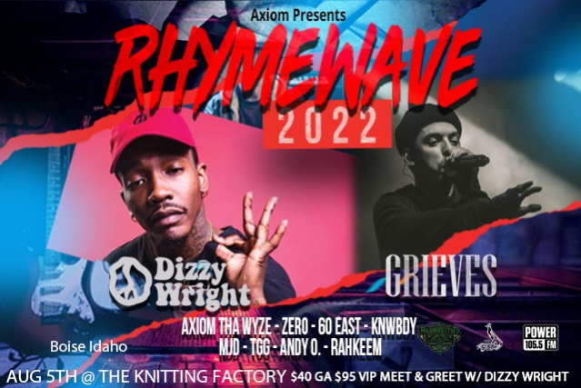 Axiom presents - Rhymewave HipHop Festival - Join us for a unique HipHop experience that will leave you wanting more! This is year 1 so we curated a list of incredible talent and skill to give the fans something special. We aim to create an environment of art music and collaboration all for the sake of the culture. Meet & Greet with Dizzy Wright, includes GA show ticket. Performing: Dizzy Wright Grieves Axiom Tha Wyze Zero TGG Knwbdy MJD Rahkeem Andy O. Thank you to our sponsors: Resurrected Tattoo, Sibbz Longboards, and Power 105