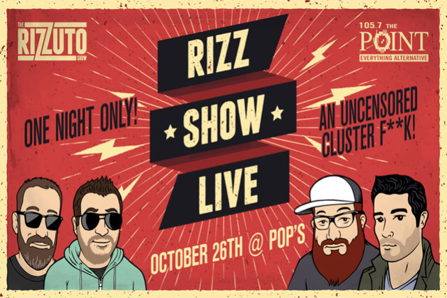 105.7 The Point presents Rizz Show Live One Night Only! An Uncensored Cluster F**k! featuring a live performace from Greek Fire Friday, October 26th Doors 6:30pm / Show 7:30pm 21 & Up Event SOLD OUT *** On-sale Times *** Presale 9/21 at 10am General On-sale 9/24 at 10am VIP Floor Seating (Online Only) Your Rizz Show Live VIP Ticket includes a premium view of the show in your seat on the floor in the first five rows directly in front of the stage. Plus, all VIP Ticket holders will receive access to an exclusive pre-show party hosted by The Rizzuto Show from 5:30p-6:30p featuring a Meet & Greet and photos with the guys, Happy Hour drink specials from 5:30p-6:30p, a complimentary appetizer buffet, and a take-home Rizzuto Show promo item.  VIP seat selection will be chosen the night-of at the event, but your ticket guarantees you a seat in the first five rows.