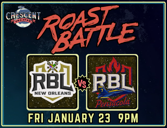 Roast Battle hits the stage LIVE at the Crescent Theater on January 23 for a no-holds-barred night of comedy carnage featuring Roast Battle League New Orleans vs Roast Battle Leage Pensacola.