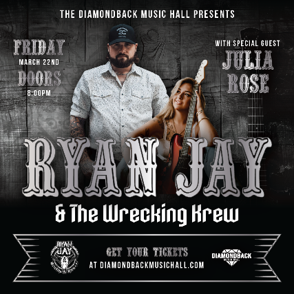 π΅πΈ Get ready for an awesome night of live music! π€ Ryan Jay & The Wrecking Krew are hitting the stage at the brand-new Diamondback Music Hall, and they're bringing special guest Julia Rose with them! π Mark your calendars for Friday, March 22nd!