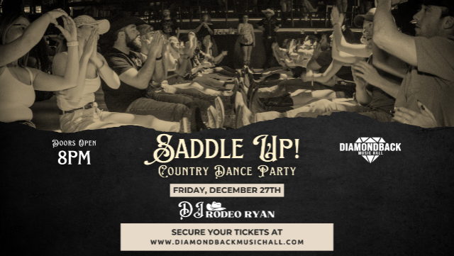 🍻Get ready to kick up your boots and line dance the night away! Saddle Up Country Dance Party is THIS FRIDAY, December 27th at Diamondback Music Hall! 🤠 Join us for the ultimate hoedown featuring DJ Rodeo Ryan, spinning your favorite tunes from 8 PM to 2 AM. 🔥