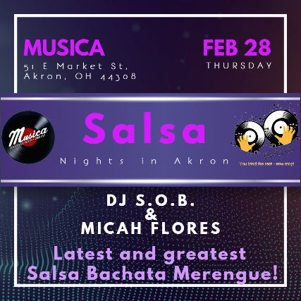 Free evening of Salsa, Bachata, and Merengue. Come join your favorite Akron DJ S.O.B. & Free lessons with Micah Flores - Beginners Wanted, no need for a partner just come join the fun.
