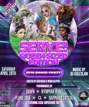 Thank you for purchasing a ticket for Serve! Saturday Queen Sized Edition on 4/20 at Royale! See below for a few details: