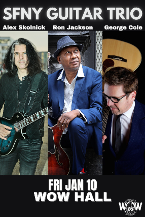 The SFNY Guitar Trio is an exciting new ensemble that hails from Brooklyn, New York, and San Francisco. The trio draws inspiration from the giants who created the 1981 best-selling album "Friday Night in San Francisco." John McLaughlin, Al Di Meola, and Paco de Lucía kicked off the world music phenomenon all those years ago, and sparks are sure to fly when these three modern-day virtuosos pick up the mantle and bring their lightning-fast technical prowess to WOW Hall on Friday, January 10. The six-string masters are led by international guitar sensation Alex Skolnick of metal titans Testament, Brooklyn-based seven-string virtuoso Ron Jackson, and American Gypsy Jazz star George Cole, former guitarist for the David Grisman Quintet. The SFNY Guitar Trio specializes in jaw-dropping original compositions while paying homage to their six-string forebears.