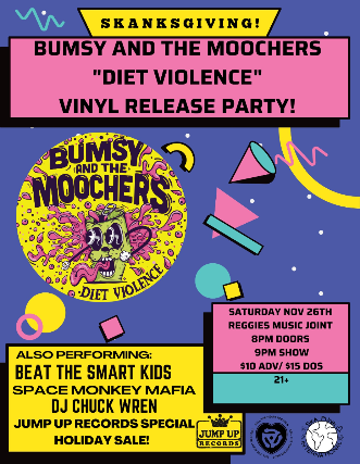 Skanksgiving Bumsy Vinyl Release Party! Reggies Bananna's Shack Saturday, November 26th 8pm doors | 9pm show | $10adv/$15dos | 21+ Bumsy and the Moochers Beat the Smart Kids  Space Monkey Mafia DJ Chuck Wren