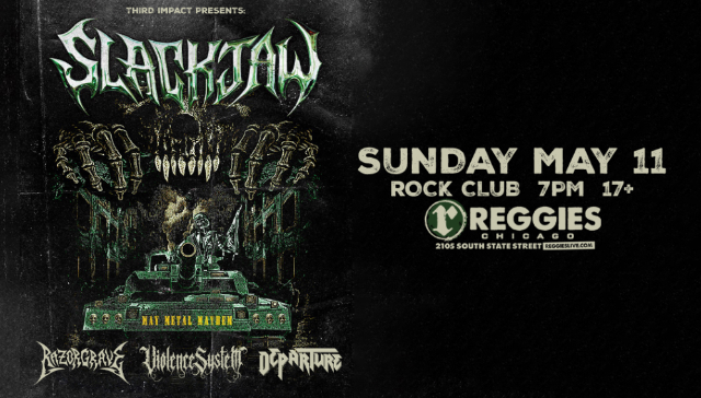 Reggies Rock Club Sunday, May 11th 7pm doors | 8pm show | $20adv/$25dos | 17+ Third Impact Presents: Slackjaw Razorgrave Violence System Departure