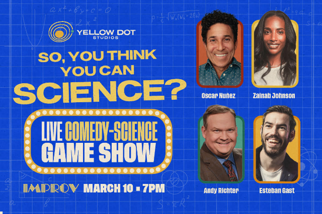 Watch comedians tackle mind-bending science challenges, while our expert scientist provides insightful commentary and debunks climate misinformation. Can our comedians impress our daring scientist and win the coveted right to proclaim, “I Can Science!” Come science around and find out!