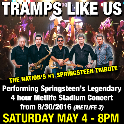 Tramps Like Us... The #1 Springsteen Tribute IN THE WORLD will be undertaking the daunting task of re-creating Bruce Springsteen’s Now Legendary 4 hour Metlife Stadium Concert from 8/30/2016 (METLIFE 3) Complete info and set list HERE: http://trampslikeus.com/metlife2016     Stan Goldstein, a Springsteen historian, blogger and author who has attended well over 300 Springsteen concerts from as far back as 1976 writes... One of the best ever shows I've seen. Timed in at four hours and 25 seconds... Springsteen dishes dream set in 3rd N.J. concert; breaks record yet again! https://www.nj.com/entertainment/music/2016/08/springsteen_nj_concert_metlife_review_2016_photos.html Bruce Springsteen and the E Street Band Break Another Record at MetLife Stadium with Epic Show. https://www.billboard.com/articles/news/7494667/bruce-springsteen-record-metlife-stadum They did it again! Bruce Springsteen and the E Street Band set another new band record for their longest U.S. concert with four hours of rock ‘n’ roll at the Met Life Stadium in East Rutherford on Tuesday, Aug,. 30. https://www.app.com/story/entertainment/music/2016/08/31/bruce-springsteen-metlife-4-hours-glory/89621306/ Springsteen does it again: Plays longest U.S. show ever at MetLife Stadium. https://nj1015.com/springsteen-does-it-again-plays-longest-u-s-show-ever-at-metlife-stadium/ Bruce Springsteen Breaks His Longest U.S. Concert Record Again In NJ. https://www.jambase.com/article/bruce-springsteen-breaks-longest-u-s-concert-record-new-jersey