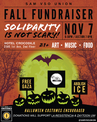 Halloween is extended to November 7th this year. SAM VSO Union is holding our second annual Halloween fundraising event “Solidarity is Not Scary, featuring DJ’s, speakers, and an art auction. Join us in raising fund for a Palestinian-led student union at the University of WA