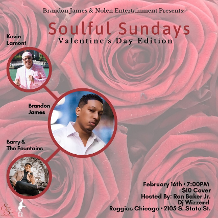 Reggies Music Joint  7pm doors / 21+ / $10    Brandon James + Nolan Entertainment present: Soulful Sundays KEVIN LAMONT BRANDON JAMES BARRY & THE FOUNTAINS Hosted by Ron Baker Jr DJ Wizzard