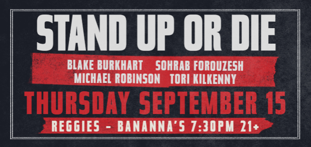 Bananna's Comedy Shack at Reggies  7:30pm doors / 8:30pm show / 21+ / $15adv - $20dos  *STAND UP OR DIE* Blake Burkhart  Sohrab Forouzesh Michael Robinson Tori Kilkenny